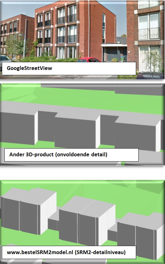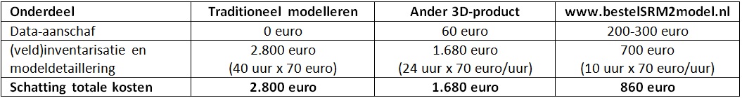 Natuurlijk zijn de specificaties van de data en een handleiding voor de invoer in WinHavik of GeoMilieu een onderdeel van het product. Prijs De prijs bedraagt 2-3 euro per hectare excl. BTW (afhankelijk van de omvang van het onderzoeksgebied en bebouwingsdichtheid), met een minimum van van 750 euro excl. BTW per opdracht Kostenbesparing Uniek aan dit product is het voor SRM2 benodigde detailniveau, waaronder ook de levering van de waarneempunten. De BAG-gebouwen en de relatie met de waarneempunten komt één-op-één terug in het 3D-model dat we leveren. Dit alles betekent dat de geluiddeskundige minder tijd kwijt is met foutgevoelig handmatig datawerk en zich meer kan focussen op het geluidadvies. Een geluidmodel van www.bestelSRM2model.nl is voor 90% gereed. Checks en verfijningen blijven nodig maar die zijn zeer beperkt ten opzichte van andere 3D-producten. De geluidadviseur wordt bovendien geholpen door, aan de data toegevoegde, 'oormerken', zoals de aanduiding van nieuwbouwlocaties waar een (veld)inventarisatie nog nodig is. Business case: Kostenbesparing met www.bestelSRM2model.nl per 1 km2 bebouwd gebied: Data is maar een deel van de totale kosten. Gebruik van www.bestelSRM2model.nl leidt tot een halvering van de totale kosten ten opzichte van gebruik van een ander 3D-product en zijn nog maar een derde van de kosten ten opzichte van ‘traditionele’ (handmatige) opzet van een SRM2-model. Interesse, proefset data en/of een vrijblijvende prijsopgaaf