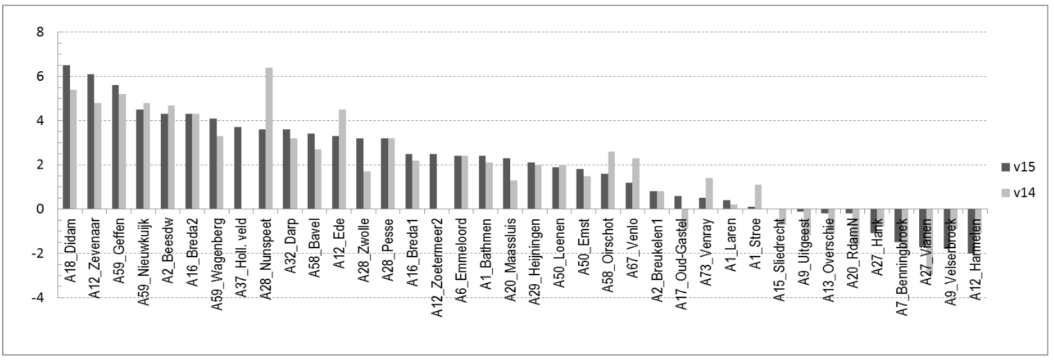 Redactie, oktober 2017 In 2012 zijn geluidproductieplafonds (GPP’s) ingevoerd voor rijkswegen- en (hoofd)spoorwegen op referentiepunten aan weerszijden langs de rijksweg en het spoor. De jaarlijkse geluidproductie (Lden in dB) op de referentiepunten dient onder een wettelijk plafond te blijven. De geluidproductie wordt jaarlijks door de weg- en spoorbeheerder berekend over het voorafgaande kalenderjaar. De Wet milieubeheer (Wm) bepaalt voorts dat een meetprogramma wordt uitgevoerd met een steekproefsgewijze validatie van de berekende geluidproductie en onderliggende rekenmethode. Dit meetprogramma wordt sinds 2012 in opdracht van het ministerie van Infrastructuur en Milieu uitgevoerd door het RIVM. Het RIVM heeft geluidniveaus gemeten op 38 punten langs rijkswegen. Die lagen in 2015 gemiddeld 2 decibel hoger dan de berekende waarden. Op de 39 meetlocaties langs het spoor kwamen de gemeten en berekende geluidniveaus in 2015 gemiddeld met elkaar overeen. Dit beeld stemt overeen met de voorgaande jaren 2013 en 2014. Op de afzonderlijke punten, zowel bij rijkswegen als het spoor, variëren verschillen ten opzichte van het gemiddelde. Bij de weg liggen de metingen tussen 2 decibel lager en 6 decibel hoger dan de berekende waarden, afhankelijk van het type en de lokale staat van het wegdek. Hieronder staan de verschillen (v15 en v14) tussen meet- en rekenwaarden uit 2015 en 2014 op de steekproef van referentiepunten uit 2015.