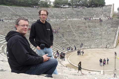 Andere voorbeelden die in reisgidsen vaak worden aangehaald om de uitmuntendheid van de akoestiek te illustreren, zijn het geluid van vallende munten en het afstrijken van een lucifer. Uit het Eindhovense onderzoek in Epidaurus blijkt echter dat het scheuren van papier en het vallen van munten maar herkenbaar is tot ongeveer de middelste rij. Voor het geluid van het afstrijken van een lucifer ligt die grens nog een stuk dichter bij het podium. Fluisteren is zelfs alleen verstaanbaar als je op de voorste rijen zit. Overigens zijn de genoemde geluiden wel tot iets verder in het theater nog nét hoorbaar, maar daar zijn ze zo zacht dat de luisteraar het geluid niet meer herkent. In geen van de drie onderzochte theaters bleek een stem met normaal volume op de achterste rij verstaanbaar. Tekst die met bijzonder luide acteerstem wordt opgevoerd, bleek daarentegen wel goed te volgen, tot helemaal achterin de drie theaters. De conclusie van de onderzoekers is dan ook dat de akoestiek van de theaters goed is, maar niet uitzonderlijk. De resultaten werden eerder dit jaar gepresenteerd op de wetenschappelijke conferentie Acoustics ’17 Boston. Het onderzoeksteam bestudeerde de Odeon van Herodes Atticus (uit 200 n. Chr.), het theater van Argos (200 v. Chr.) en het theater van Epidaurus (400 v. Chr.). Vooral dit laatste theater is veelgeprezen vanwege zijn akoestische kwaliteit. In alle theaters verrichten de onderzoekers meerdere metingen op honderden plaatsen, om de hoorbaarheid van geluiden over het gehele publieksvlak in beeld te krijgen. Ze deden dat op meerdere momenten van de dag, omdat de akoestiek kan veranderen door verschillen in temperatuur en luchtvochtigheid. De resultaten vergeleken ze met eigen gegevens over de herkenbaarheid en hoorbaarheid van de eerder genoemde geluiden, zoals het vallen van munten. Daarnaast deden ze aparte metingen om de spraakverstaanbaarheid in kaart te brengen. De onderzoekers konden de akoestiek in zoveel detail in beeld brengen dankzij een nieuwe, zelf ontwikkelde meetmethode. Ze gebruikten een draadloos systeem, waardoor ze snel op veel verschillende plaatsen metingen konden doen. Dat lijkt simpel, maar in akoestische metingen zijn de kleine vertragingen die kunnen optreden tussen de gescheiden afspeel- en opnameapparatuur, een storende factor. Die vertragingen ontstaan doordat de kloksnelheid van de apparaten nooit exact gelijk is. De Eindhovense onderzoekers hebben dit probleem weten op te lossen. Het startpunt voor het onderzoek was een reisgids die al zo’n dertig jaar in de kast staat van onderzoeksleider Constant Hak, met daarin de gebruikelijke beweringen over de akoestiek. Als akoesticus wilde hij altijd al graag die akoestiek in detail gaan meten, en met de nieuw ontwikkelde meetmethode werd dat mogelijk. Samen met onderzoeker Remy Wenmaekers en masterstudenten van de TU Eindhoven reisde hij naar Griekenland om de metingen te doen. Ondanks de bevindingen blijft de beleving van de theaters voor Hak en zijn collega's magisch. En de akoestische kwaliteit is goed, benadrukken ze. Maar de verhalen in de reisgidsen over de haast mythische akoestiek, mogen wat hen betreft wel wat bijgesteld worden. Bron: TU Eindhoven |